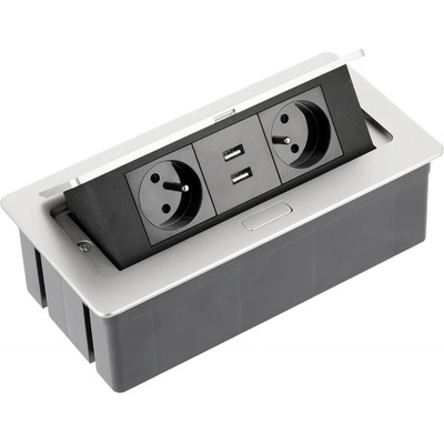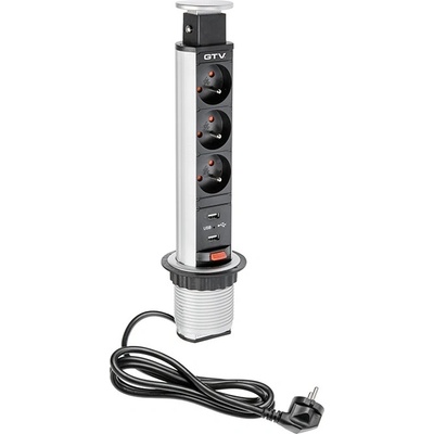 Výsuvná zásuvka GTV – 3× 230 V + 2× USB, stříbrná Výsuvná zásuvka GTV ve stříbrném provedení kombinuje 3 zásuvky 230 V s 2 USB porty pro snadné nabíjení mobilních zařízení....