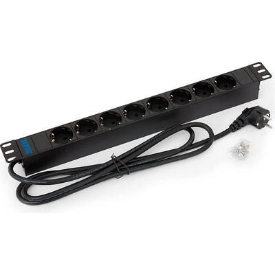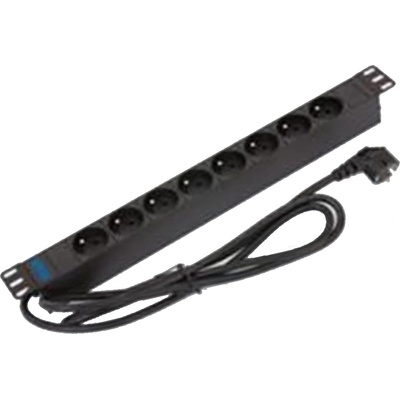 19“ rozvodný panel 1U; 8 x zásuvka podle ČSN, max. 16 A; kabel 3 x 1,5 mm, 2 m + zástrčka univerzál CZ-DE max. 16 A; RAL 9005 Technické parametry: výška: 1U počet zásuvek: 8...