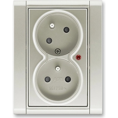 Zásuvka dvojnásobná s ochrannými kolíky, s clonkami, s natočenou dutinou, s ochranou před přepětím - starostříbrná. Optická signalizace poruchy. Řazení: 2x(2P+PE) 16...