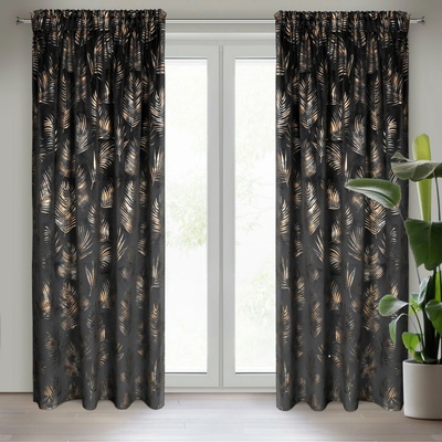 Závěs GLORIA ze sametové látky, příjemné na dotek se vzorem exotických listů. Třpytivý potisk exotických listů ve stříbrných a zlatých barvách aplikovaný na kontrastním pozadí...