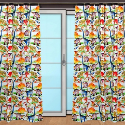 Zatemňovací neboli "blackoutová" dekorační látka s vysokou zastiňovací schopností s dětským vzorem barevných kreslených dinosaurů jako živých na bílém podkladu. Látka na závěsy...