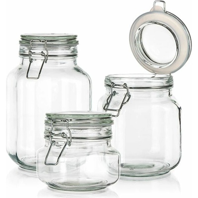 Sada skleněných hermetických dóz EREA 0,5 l + 1 l + 2 l se skleněným víčkem a kovovým zavíracím patentem. Víčko je osazeno silikonovým těsněním. Drátěný systém uzávěru není...