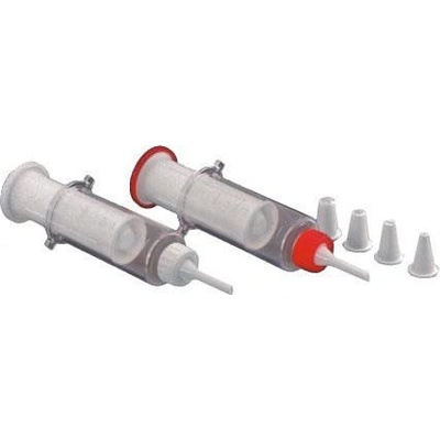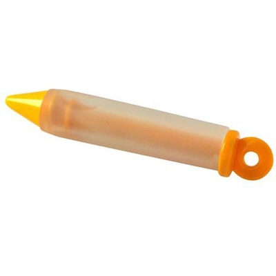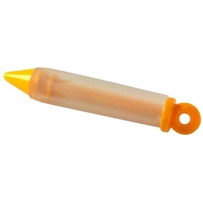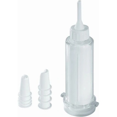 Pístová zdobička pokrmů z průhledného silikonu a plastu. Lze použít na krémy, polevy, šlehačku, slané paštiky, pomazánky ke zdobení dortů, koláčů, jednohubek, obložených chlebíčků. Materiál - silikon. Silikon je lehce omyvatelný. Rozměry - 2,2 x 15 cm.