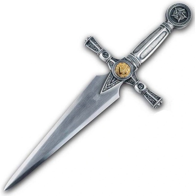 Dýka Zednář Celková délka 44cm Čepel z kalené nerez oceli AISI 440 Rukojeť je odlévaná ze Zamaku (zinkové slitiny). Její povrch je zdobený plátkovým stříbrem a zlatem. Dodávka bez pochvy Jedná se dekorativní předmět, který není určen na boj či jiné praktické...