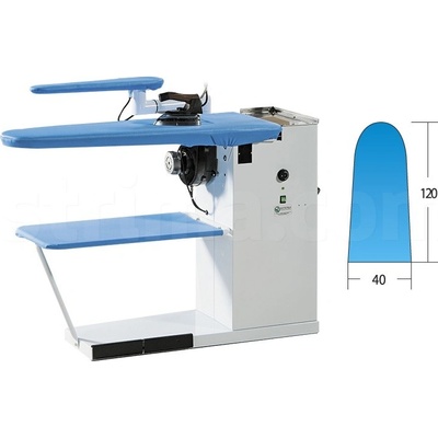 Žehlící prkno s typem desky 40x120 cm. Odsávání a ofuk z povrchu desky 0,37 kW, příkon vyhřívání povrchu desky 0,8kW, výška žehlící plochy 91cm, odsávaný a vyhřívaný rukávník...