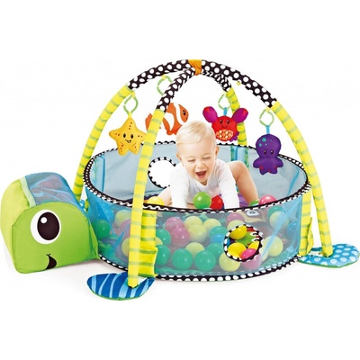 Měkká a barevná podložka s motivem želvy podporuje rozvoj smyslů, motoriky a představivosti miminek. Obsahuje bazén s 30 barevnými míčky a závěsné mořské hračky pro zábavu i...