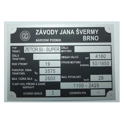 Výrobní štítek traktoru Zetor ZTS - český popis