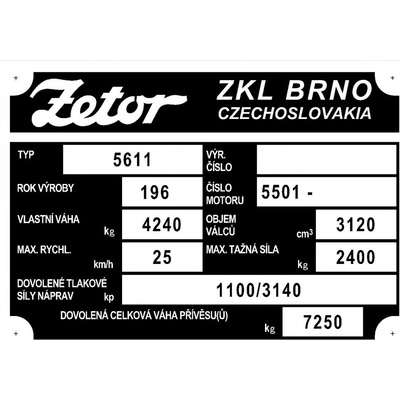 Věrná replika původních štítku.Provedení elox. hliník. Doživotní záruka na černou barvu.Další služba: Na výrobní možný dotisk nebo ražba (raznice 4mm) Vašich údajů. Dotisk nebo...
