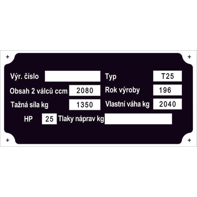 Věrná replika původních štítku.Provedení elox. hliník. Doživotní záruka na černou barvu.Další služba: Na výrobní možný dotisk nebo ražba (raznice 4mm) Vašich údajů. Dotisk nebo...