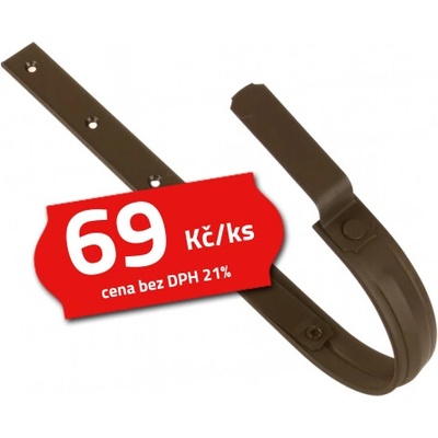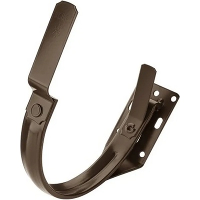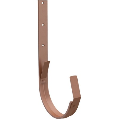 Žlabový hák čelní pro půlkruhový okapový žlab rozvinuté šířky 250 mm (odpovídá průměru žlabu 100 mm). Materiál: lakovaná pozinkovaná ocel. Hnědá.