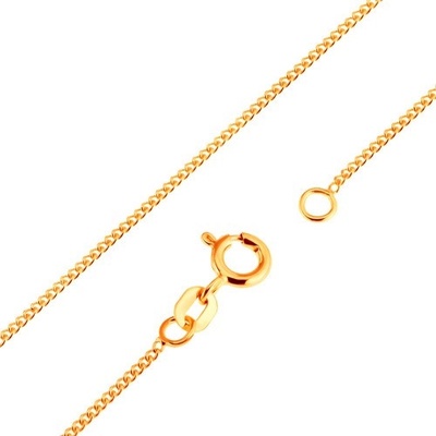 Řetízek ze žlutého zlata 750 je tvořen malými elipsovitými články s plochým povrchem - vzor Curb, zapínání na perový kroužek.