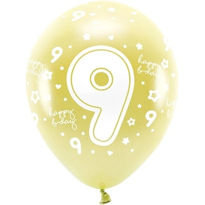 V balení je 5 ks balónků zlatých metalických s potiskem čísla a 5 ks balónků zlatých chromových biologicky rozložitelné. Průměr balónku v nafouknutém stavu je 30 cm, výška 38...
