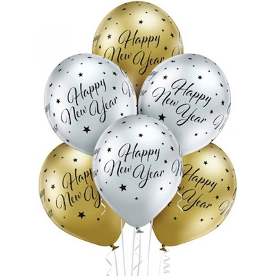 Nafukovací metalové balónky s černým potiskem hvězdiček a nápisem Happy New Year. Balónky jsou vhodné k nafukování vzduchem i héliem. Vyrobené z latexu přírodního kaučuku....