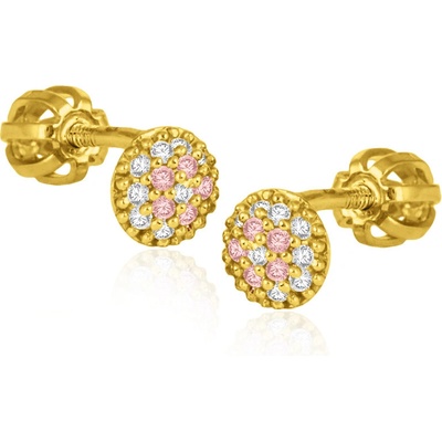 Nechte se okouzlit jiskřivými bílými zirkony a růžovými kamínky osazenými ve žlutém zlatě. Dětské náušnice, ryzosti 14 karátů, kulatého tvaru předkládají precizní umění...