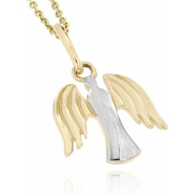 Krásný přívěsek vyrobený ze žlutého zlata v ryzosti 585/1000. Přívěsek zobrazuje postavu anděla, tělo je hladké a lesklé. Anděl drží v ruce srdce přezlacené bílým zlatem....