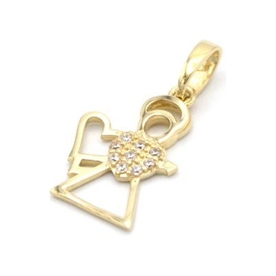 Zlatý přívěsek andílek je vyrobený ze žlutého zlata a je zdobený čirými zirkony. Rozměr přívěsku je 16x15 mm. Celková výška přívěsku s ouškem je 20 mm.