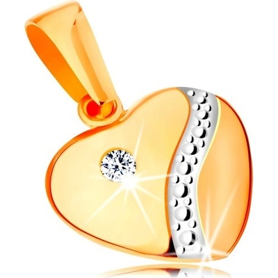 Lesklo-matný přívěsek v kombinovaném zlatě 585, srdíčko se vsazeným zirkonem čiré barvy a zvlněnou gravírovanou linií.