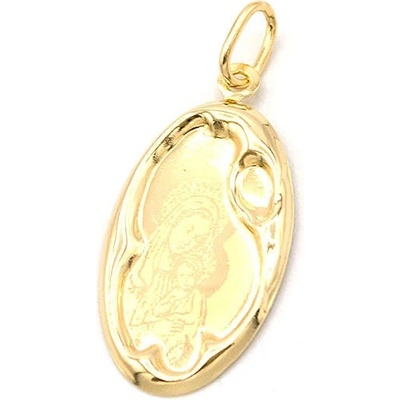Dámský zlatý přívěsek oválná Madonka s dítětem ze žlutého zlata.Elegantní přívěsek žluté zlato oválného tvaru s podobiznou Madonky držící dítě obohacený zdobením.Rozměry: ovál...