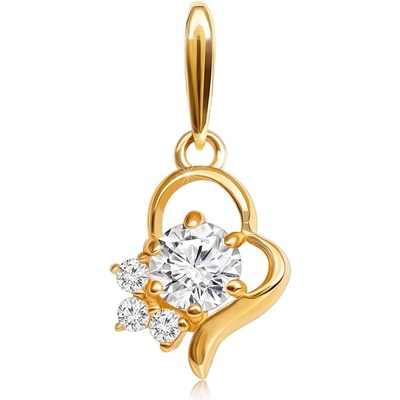 Přívěsek ze žlutého 14K zlata, neúplný obrys asymetrického srdíčka, jeden velký a tři drobné zirkony čiré barvy.