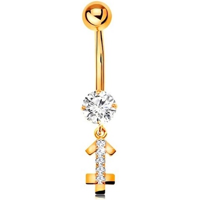 Piercing do pupíku ze žlutého zlata 585, banánek s kuličkou a čirým zirkonem v kotlíku, znamení zvěrokruhu - STŘELEC.