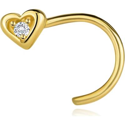 Zahnutý nosový piercing ze žlutého zlata zdobí motiv srdce s čirým kulatým zirkonem uprostřed. Hladký povrch a plynulá křivka poskytují pohodlné nošení a čistý vzhled. Drobná...