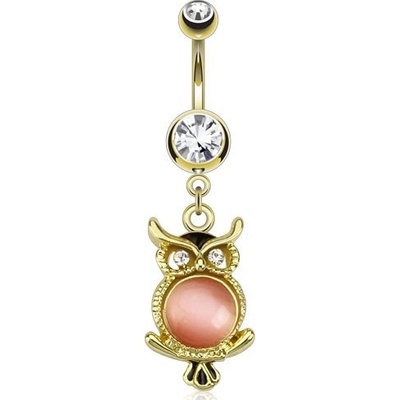 Piercing do břicha z oceli, zlatý povrch, čiré zirkony, sova, hladký růžový kamínek.
