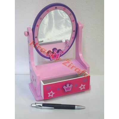 Krásné zrcadlo pro Vaše malé princezny do jejich kouzelných pokojíčků. Dřevěné zrcadlo se zásuvkou pro maličkosti, které má každá malá slečna. Pěkná dekorace na stůl nebo polici do dětského pokoje. Věk: 3+ Materiál: dřevo Rozměry: 16,2 x 8,5 x 24,2cm