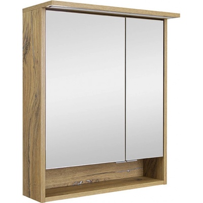 Popis: • zrcadlová skříňka závěsná s LED osvětlením • 3 x dvířka Soft-Close • 2 x police sklo • elektrobox s vypínačem a el. zásuvkou Materiál: korpus: LTD 16 mm, dub...
