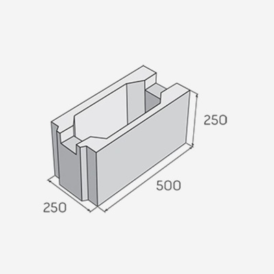 dutinová tvárnice, z vibrolisovaného betonu, k provádění svislých konstrukcí (stěny, opěrné zdi, ploty a nadezdívky základových pasů), boky tvárnic vytváří zámek, pevnost v tlaku 15 MPa, spotřeba 8 ks/m2, 250×500×250 mm, 50 ks/pal.