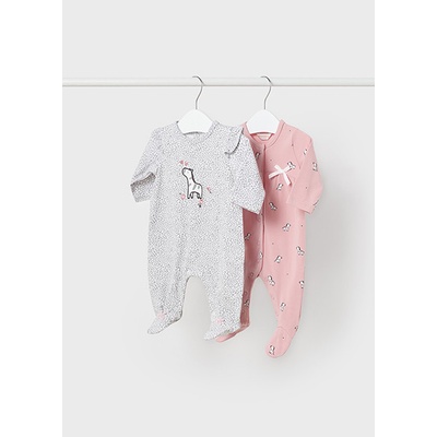 Balení dvou overalů v barvě růžové s drobným vzorem zeber, na rozpínání druky ve přední části a mezi nožičkami. Druhý overal má zapínání vzadu a mezi nožičkami. Je potištěný...