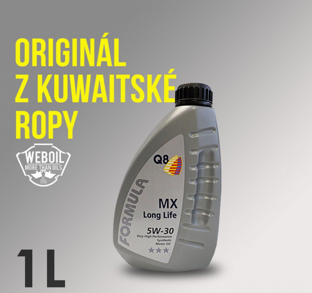 Q8 Formula MX Longlife 5W-30 je plně syntetický, vysoce výkonný motorový olej pro osobní automobily s nízkým obsahem sulfátového popela, fosforu a síry (low SAPS). Vhodný pro atmosférické i přeplňované benzínové, naftové a LPG motory. Speciálně vyvinut pro nové motory MB vyžadující specifikaci MB 229.52. Umožňuje prodloužené intervaly výměny oleje (až 2 roky) a použití v motorech Euro 5 a Euro 6.