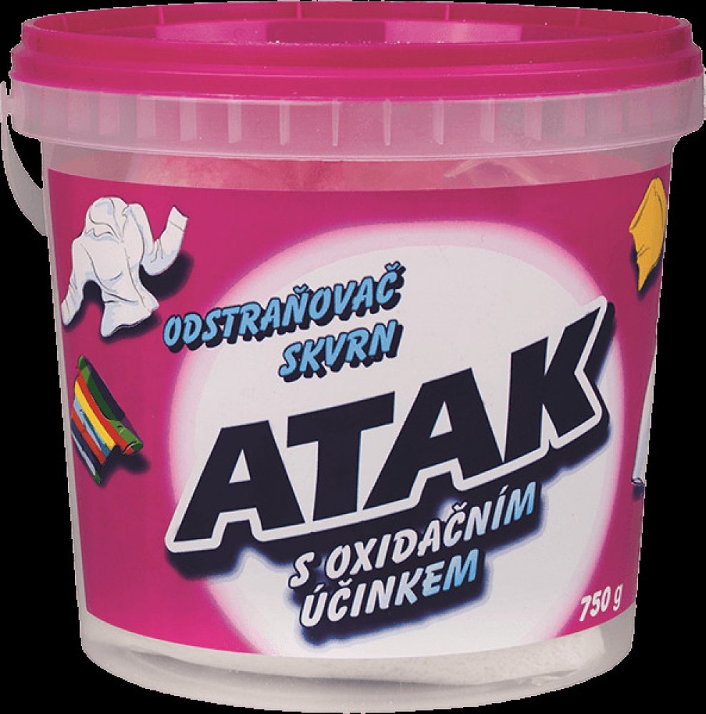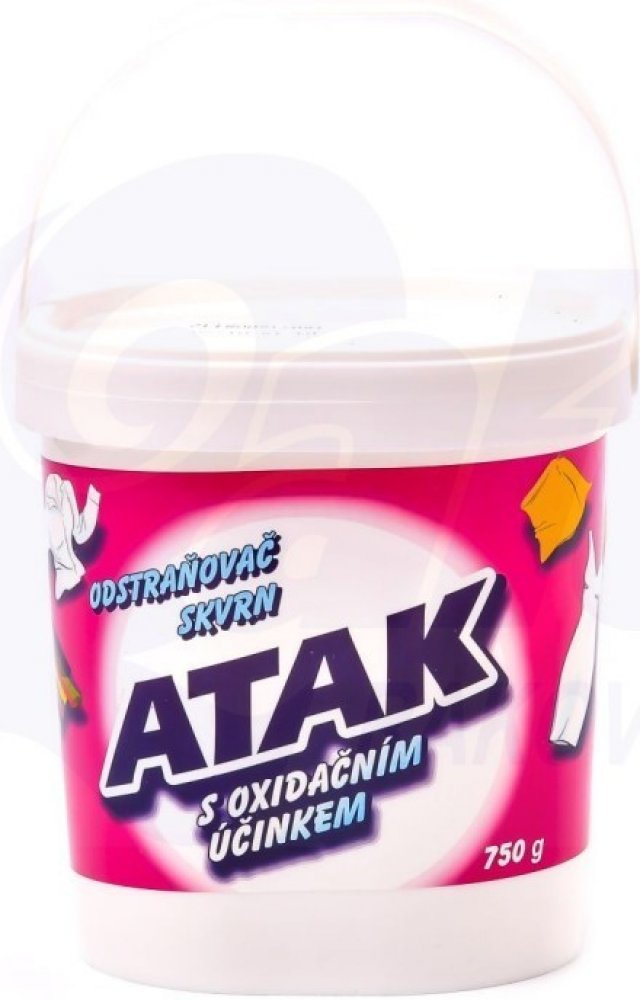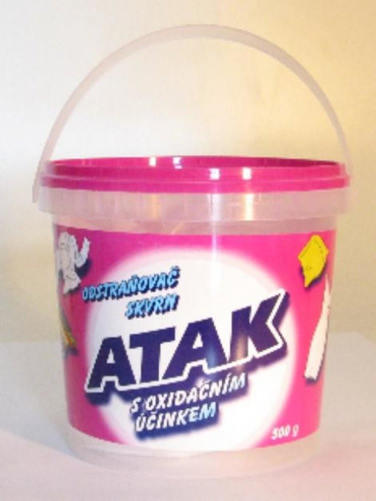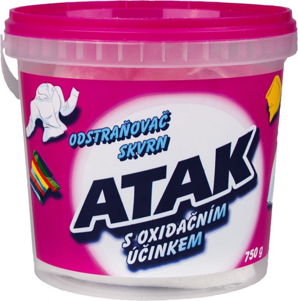 Atak je vhodný na čištění velmi zašpiněného, zažloutlého či zapraného prádla, sportovního oblečení, dětského prádla, ručníků, ubrousků, záclon, syntetických koberců a čalounění. Stačí přidat k běžnému pracímu prostředku nebo nanést přímo na skvrnu. ATAK účinně odstraňuje i velmi odolné skvrny např. od červeného vína, ovoce, kávy, čaje, inkoustu, apod.. Jelikož neobsahuje chlór, chrání pevnost vašeho oblečení i jeho barvy.