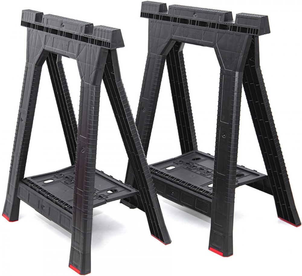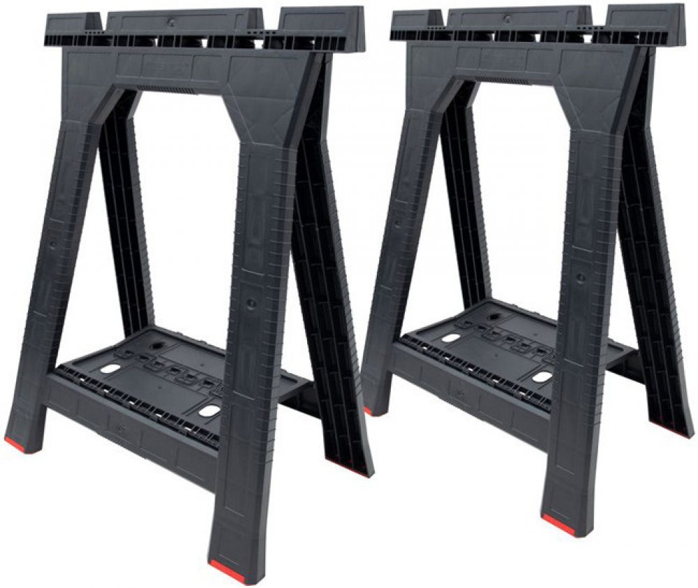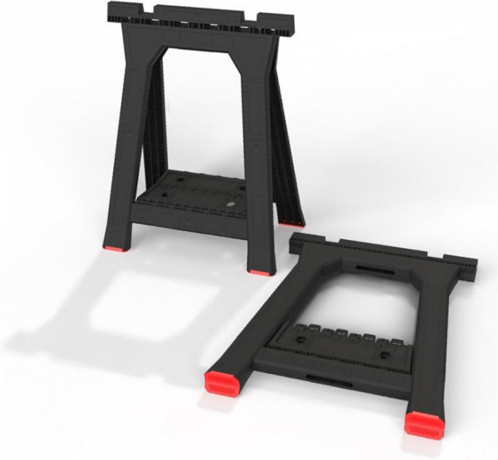 Vysoce kvalitní multifunkční stojan se zesílenou konstrukcí a protiskluzovýma nohama vybavený přídavnou policí mezi nohama, držáky na ruční nářadí a funkčními stabilizačními štěrbinami pro řezání materiálů. Konstrukce umožňuje upevnění pracovní desky pomocí šroubových svorek. Maximální nosnost je 350 kg.