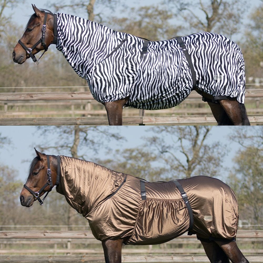 Tato speciální ekzémová deka je včetně krčního dílu. Deka má elastické, nastavitelné lemy, aby koni správně seděla na těle. Také má širokou klopu na ocas a nastavitelný lacl pod břicho. Výzkum prokázal že vzor zebry odrazuje mouchy, protože pruhy odrážejí světlo a tento odraz dráždí hmyz. Deka má nastavitelné popruhy pod nohy.