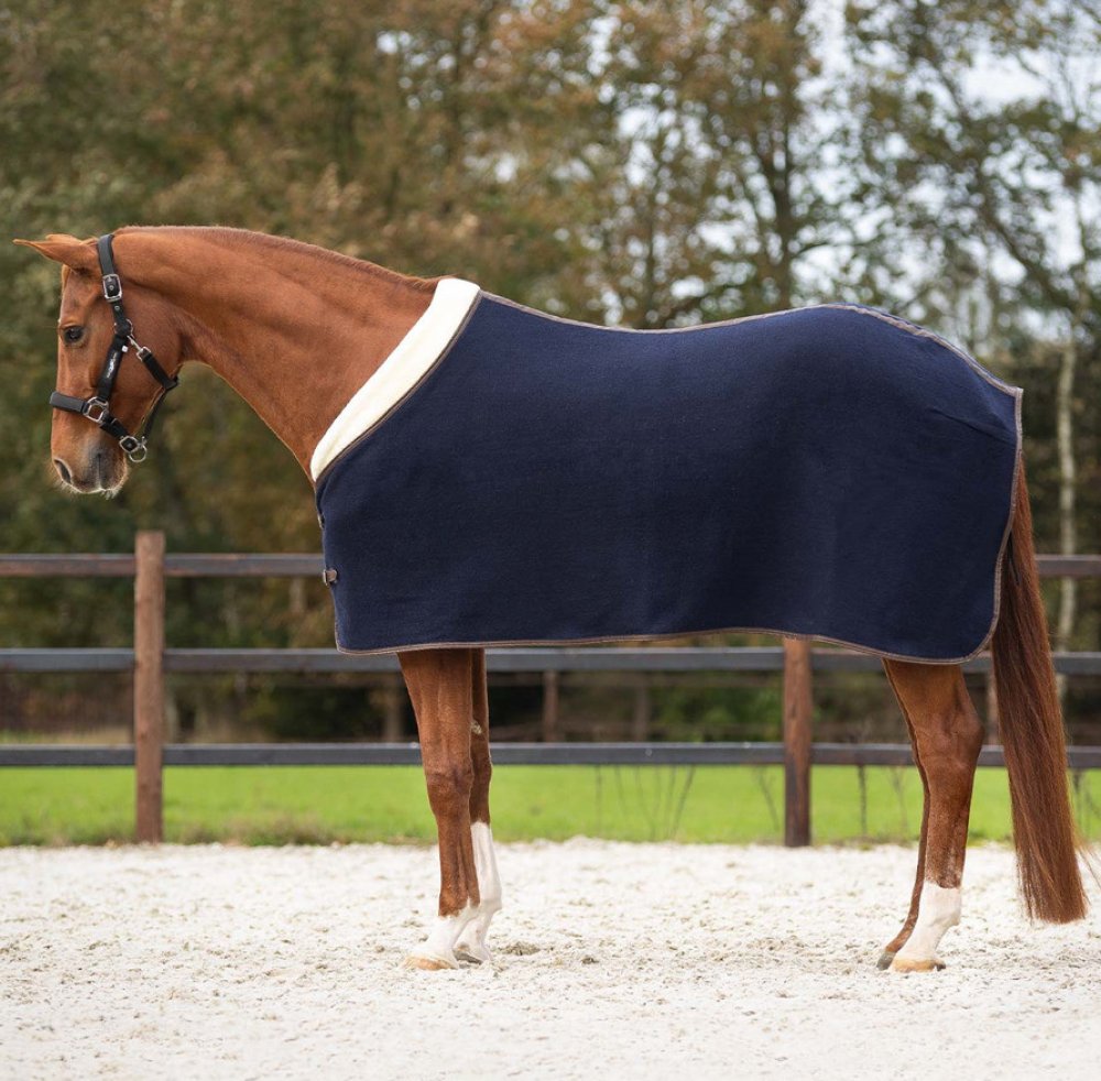 Odpocovací deka z velmi kvalitní vlny o gramáži 650 g/m2. Díky použitému materiálu je deka prodyšná, rychle absorbuje vlhkost a koně udrží v teple. Opatřena je límcem ze syntetické vlny, který zabraňuje odírání v oblasti kohoutku. Přední dvojité zapínání na přezky. Přední zapínání a lem deky je zdobený imitací kůže. Lze prát v pračce na speciální program pro vlnu. Použijte nejlépe prací prostředek...