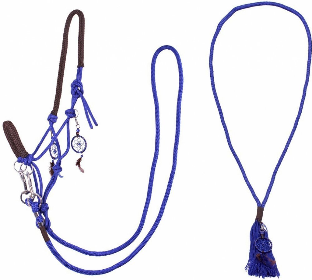 Provazový set - ohlávka, otěže a nákrčník z 10mm lana. Ohlávka je vybavena kroužky pro připojení otěží. S přívěsky na ohlávce a nákrčníku, které jsou odnímatelné. Vhodný na přirozené ježdění bez udidla.