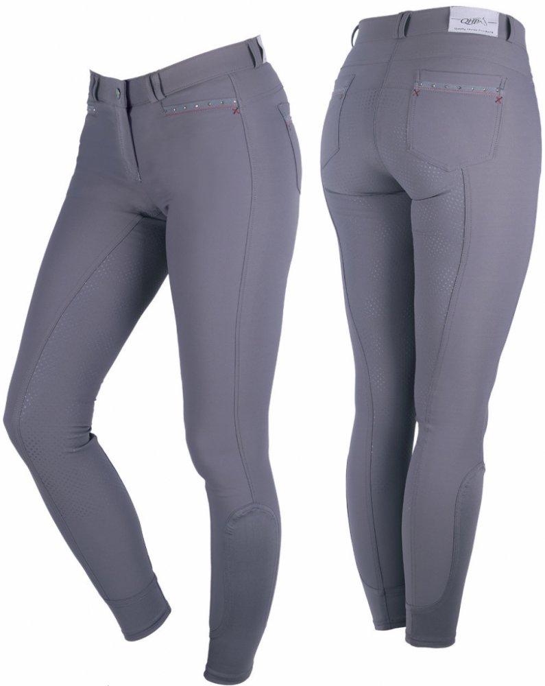 Elegantní rajtky, které jsou vyrobené z pružné tkaniny, která odpuzuje vodu a rychle schne. Tudíž jsou vhodné do slabého deště. Rajtky jsou opatřeny silikonovým protiskluzovým gripem pro větší pohodlí. Jsou vybaveny dvěma kapsami na zip a kapsičkou na mince na přední straně. Kapsy jsou zdobeny semišem s kamínky a kontrastním prošíváním. Rajtky mají nápis „Equestrian Sports“ pod kapsou na levé stra...