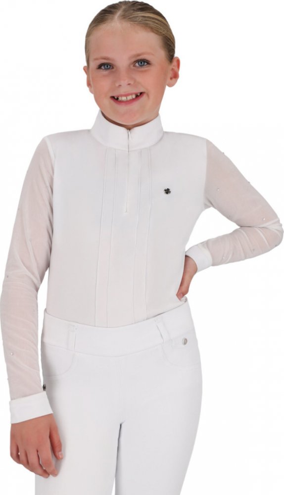 Dětské závodní tričko Sennah s dlouhým rukávem vyrobené z pružného materiálu, který zajišťuje vysoký komfort při nošení. Rukávy jsou z jemné síťoviny a zdobené třpytivými kamínky, navíc jsou pružné a přizpůsobí se pohybu. Tričko je vybavené skrytým zipem a na levé straně hrudi je zdobené logem výrobce.