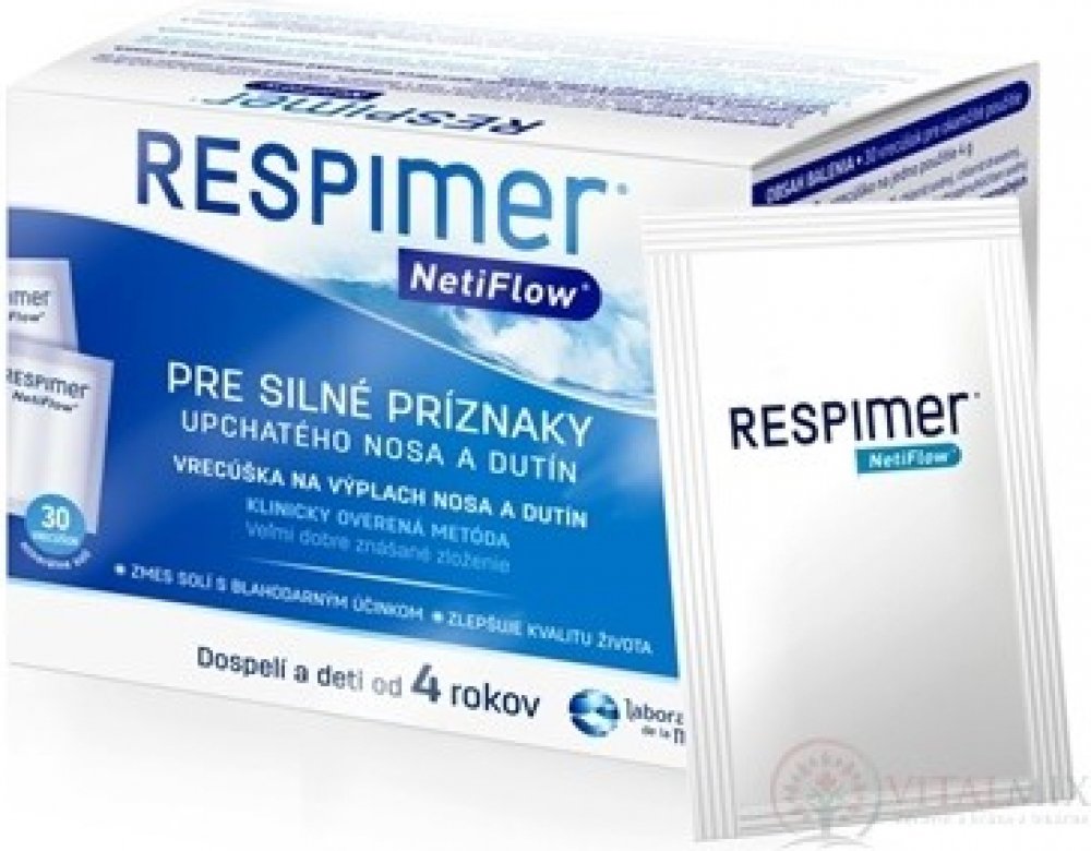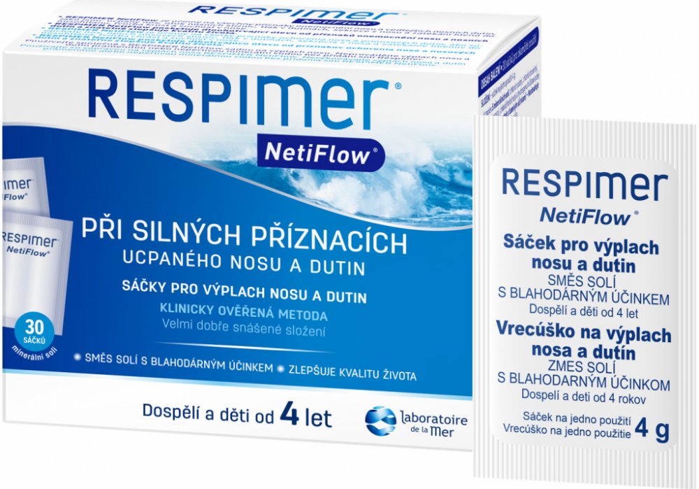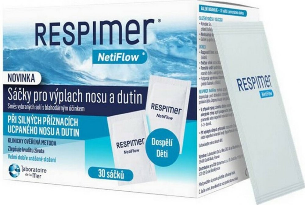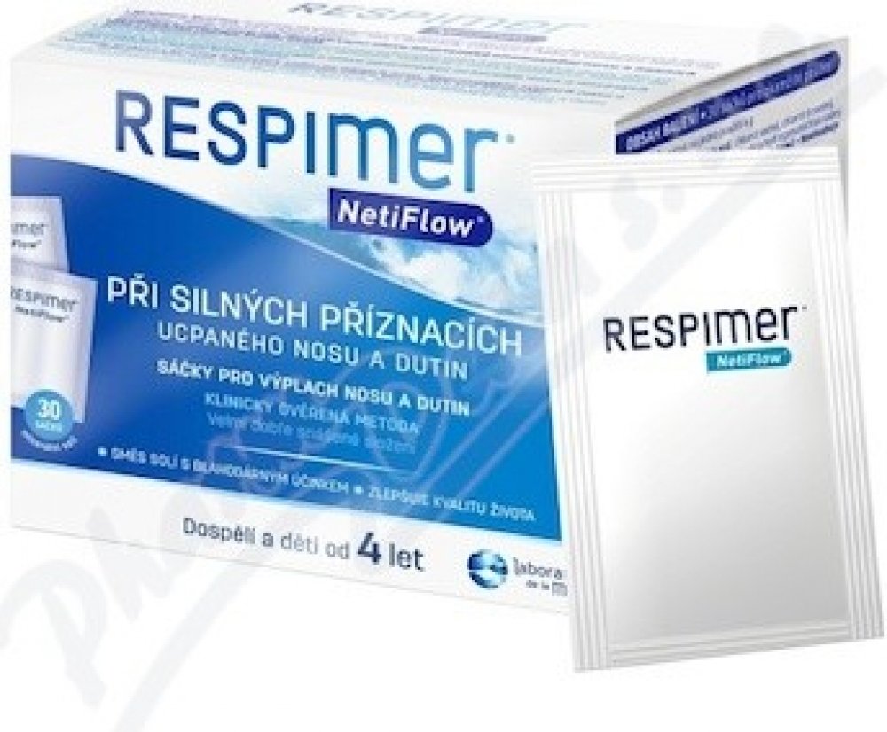RESPIMER NetiFlow je účinný na všechny příznaky onemocnění nosu a vedlejších nosních dutin, jako jsou: ucpaný nos, otok nosních sliznic, tlak v dutinách, sekrece z nosu a natékání hlenů do nosohltanu, tvorba krust a suchost v nose...