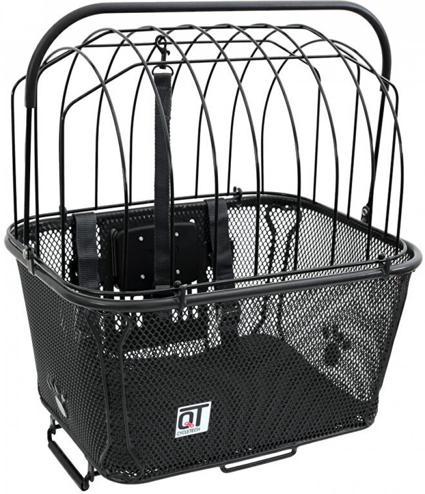 Univerzální drátěný koš na kolo s ochrannou klecí pro montáž na zadní nosič s možností montáže na řidítka.