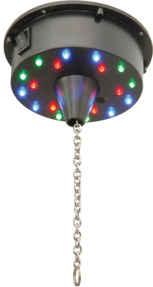 Velmi tichý bateriově poháněný motor pro zrcadlové koule do 3 kg. Obsahuje 18 RGB LED diod pro vytvoření úžasného světelného efektu. Možnost statické nebo pomalé změny barevného spektra.