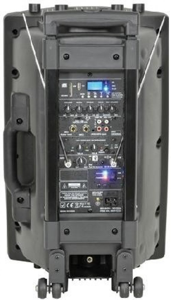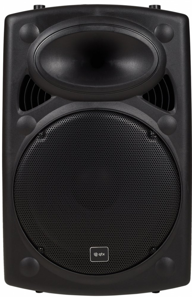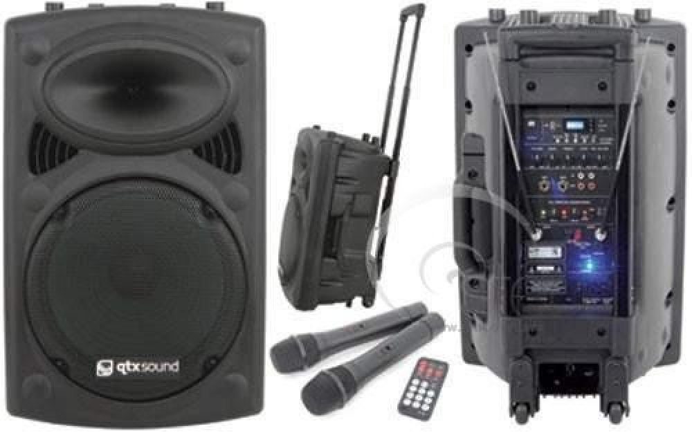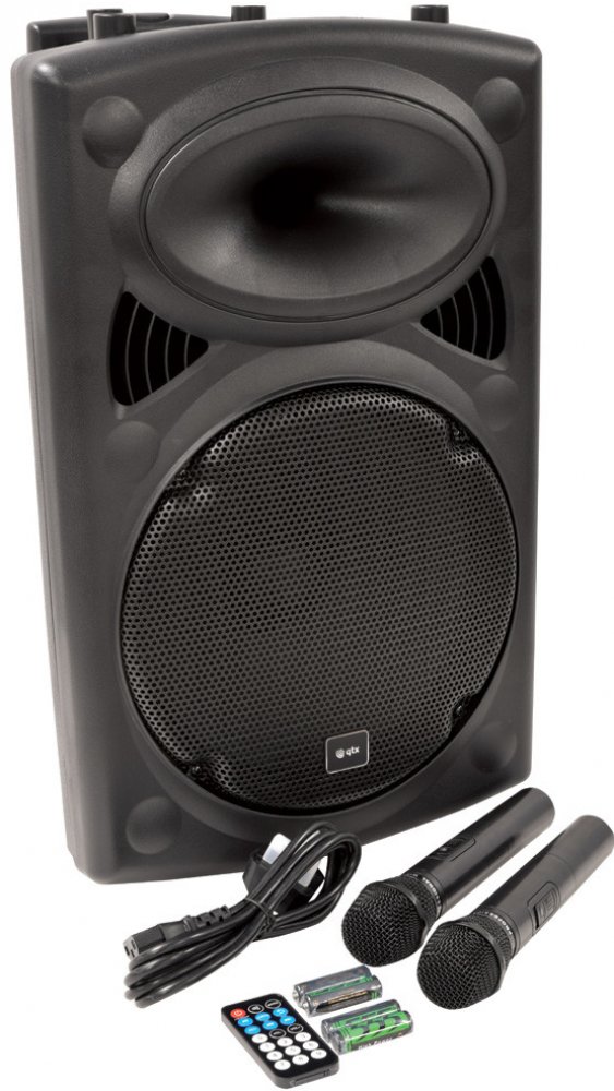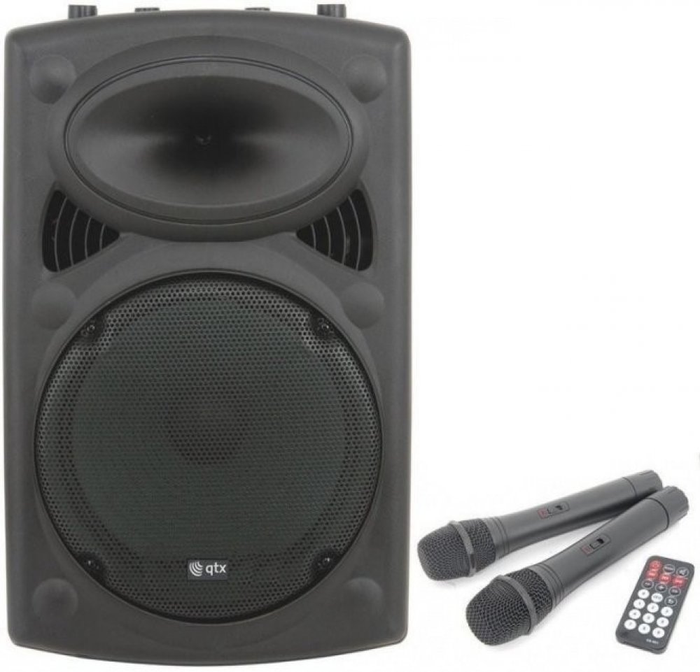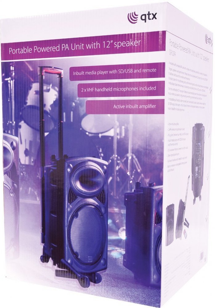 Ozvučovací systém Přenosný PA 12" řečnický systém řady QR. Vestavěný zesilovač s výstupním výkonem 50 + 50W RMS (LF + HF) napájený ze sítě nebo interního nabíjecího akumulátoru (provoz na akumulátor až 8 hodin). Součástí dodávky je 2x VHF ruční bezdrátový mikrofon (frekvence 174.1MHz + 175.0MHz), zabudovaný přijímač a zesilovač na zadní straně vč. ovládacích prvků (regulace hlasitosti, Echo efekt, korekce basů a výšek a regulace vstupní úrovně bezdrátových mikrofonů), 2 mikrofonní vstupy s Echo efektem. Vstupy: linkový (AUX) / USB / SD. Zasouvací rukojeť a kolečka pro snadnou manipulaci a transport. Napájení: externí - 220/240V AC, 50/60Hz, interní - zabudovaný akumulátor 12V . Výkon 12“ reproduktoru 200W RMS.
