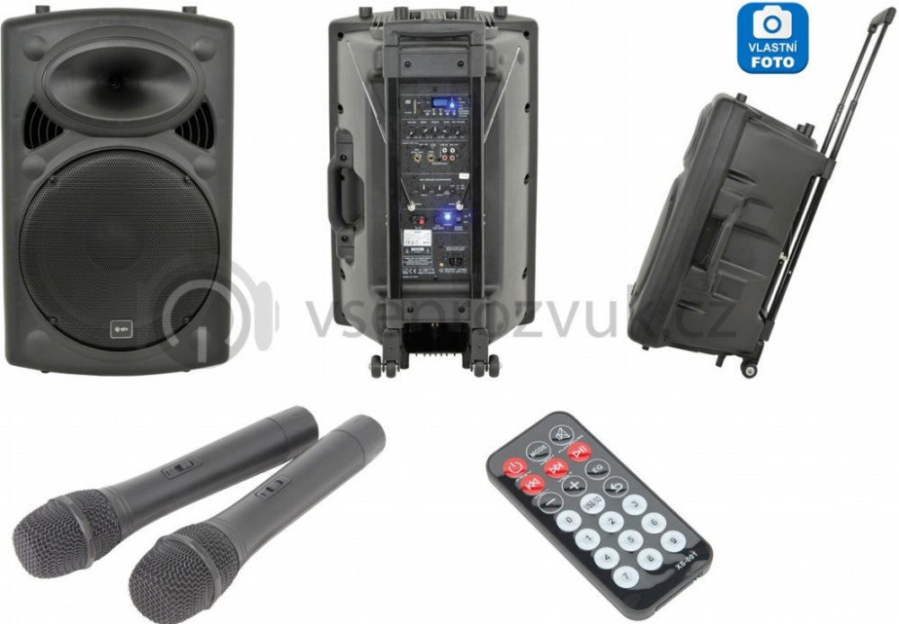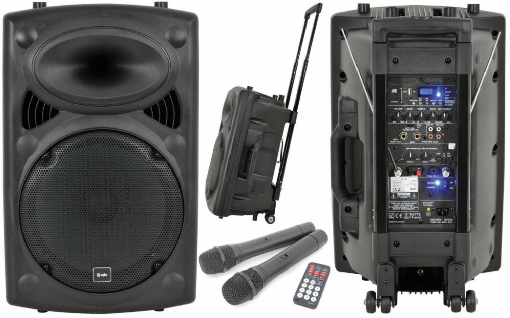 Ozvučovací systém Přenosný PA 12" řečnický systém řady QR. Vestavěný zesilovač s výstupním výkonem 50 + 50W RMS (LF + HF) napájený ze sítě nebo interního nabíjecího akumulátoru (provoz na akumulátor až 8 hodin). Součástí dodávky je 2x VHF ruční bezdrátový mikrofon (frekvence 174.1MHz + 175.0MHz), zabudovaný přijímač a zesilovač na zadní straně vč. ovládacích prvků (regulace hlasitosti, Echo efekt,...