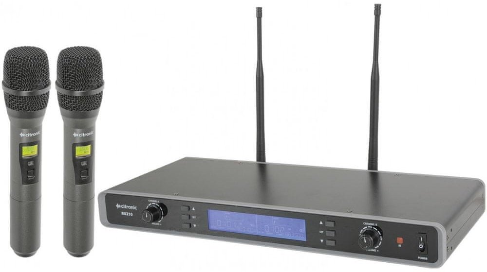 Dvoukanálový UHF mikrofonní systém. Sestava se skládá z přijímacího receiveru, dvojice kapesních vysílačů a dvou klopových a dvou hlavových mikrofonů. PLL (Phase Locked Loop) technologie ladění, která zajišťuje stabilní přenos signálu a jeho vysokou kvalitu. Možnost manuálního výběru přenosové frekvence nebo automatické párování mikrofonů s přijímačem pomocí RF signálu. Napájení vysílačů pomocí tu...