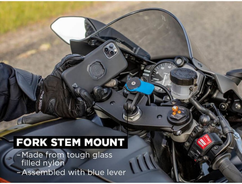 Držák mobilního telefonu na motorku Quad Lock Fork Stem Mount PRO. Černě anodizovaná hliníková konstrukce držáku pro 100% stabilitu a robustnost, prodloužené a vysoce nastavitelné rameno hliníkové verze zajišťuje pohodlnější polohování telefonu pro maximální přizpůsobitelnost.