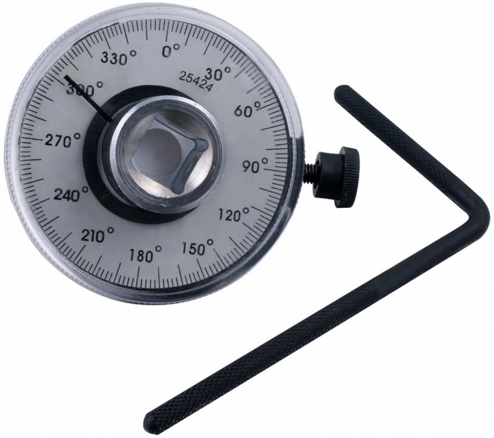 Úhloměr pro momentový klíč 1/2“, analogový, s nastavitelným snímačem a kruhovou stupnicí 0-360 ° – QUATROS QS30369 Speciální přípravek určený pro utahování šroubových spojů, kdy není předepsán utahovací moment, ale úhel dotažení. Dobře čitelná kruhová stupnice (černá čísla na bílém podkladě) je dělená po 2 ° v intervalech 10 ° a 30 °. Snadné nastavení výchozí polohy 0 ° a její fixace.