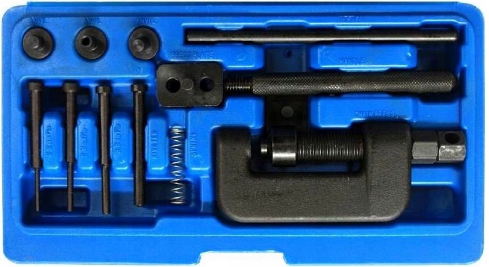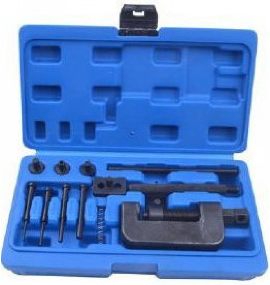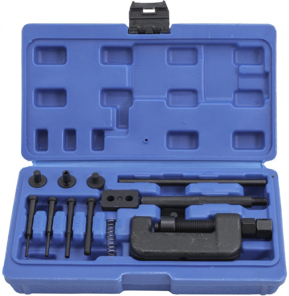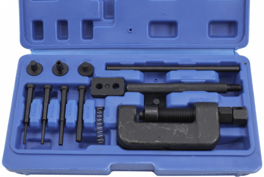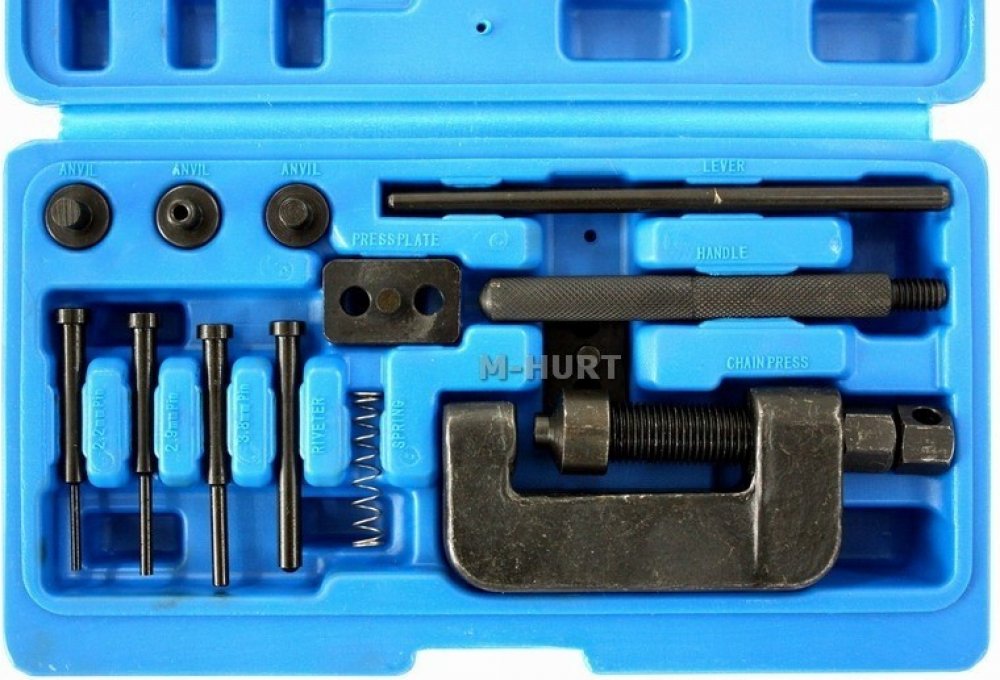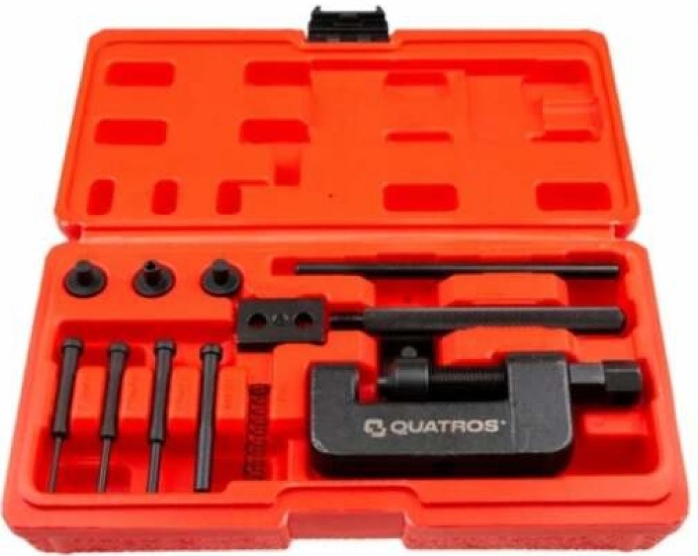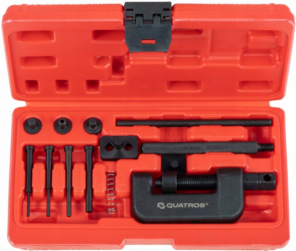 Sada pro nýtování motocyklových a rozvodových řetězů, čtyřdílná, univerzální, praktické plastové pouzdro – QUATROS QS10095. Univerzální nýtovací sada na spojování a rozpojování motocyklových a rozvodových řetězů. Lze použít na motocyklové řetězy o velikosti až 630. Sadu lze použít také k nýtování plných nýtů, jako např. u řetězu značky D.I.D. K nýtování lze použít přiloženou rukojeť, nebo lze nasa...