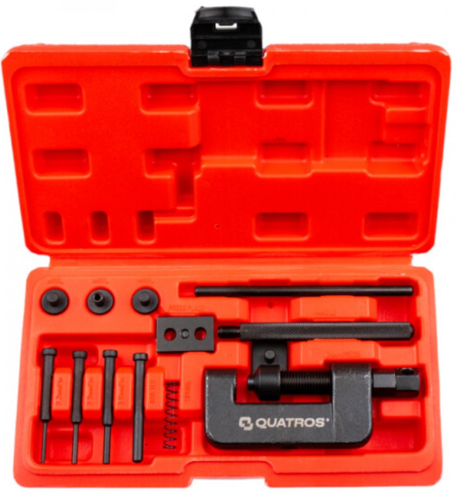 Sada pro nýtování motocyklových a rozvodových řetězů, čtyřdílná, univerzální, praktické plastové pouzdro – QUATROS QS10095.Univerzální nýtovací sada na spojování a rozpojování motocyklových a rozvodových řetězů. Lze použít na motocyklové řetězy o velikosti až 630. Sadu lze použít také k nýtování plných nýtů, jako např. u řetězu značky D.I.D.K nýtování lze použít přiloženou rukojeť, nebo lze nasadit ráčnu s 13 mm hlavicí. Dodáváno v praktickém plastovém kufříku.Před každým použitím je vhodné zkontrolovat závit, zda je čistý a nepoškozený, a namazat jej. Mazání usnadní nýtování a chrání závity proti nadměrnému opotřebení.Sada obsahuje čtyři trny:· o 2,2 mm – pro řetězy až 25 ANSI / DIN ISO 04 (rozvodové řetězy)· o 2,9 mm – pro řetězy až 35 ANSI / DIN ISO 06· o 3,8 mm – standard pro