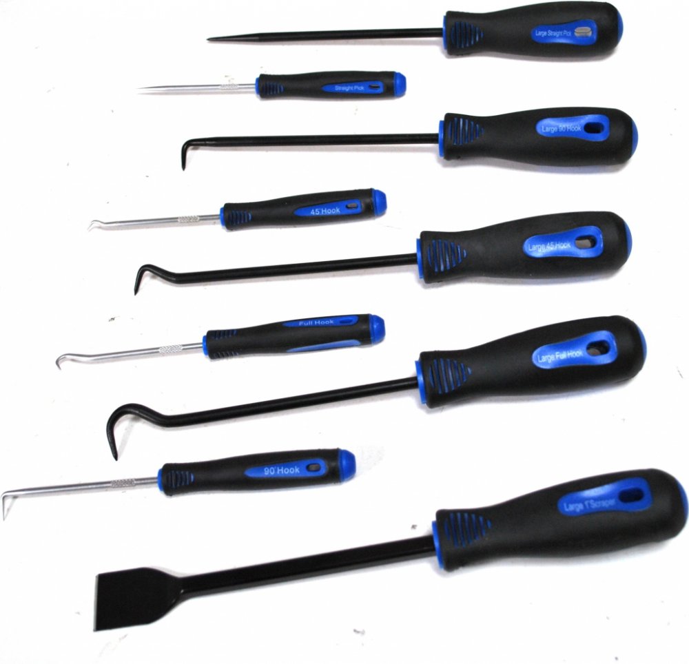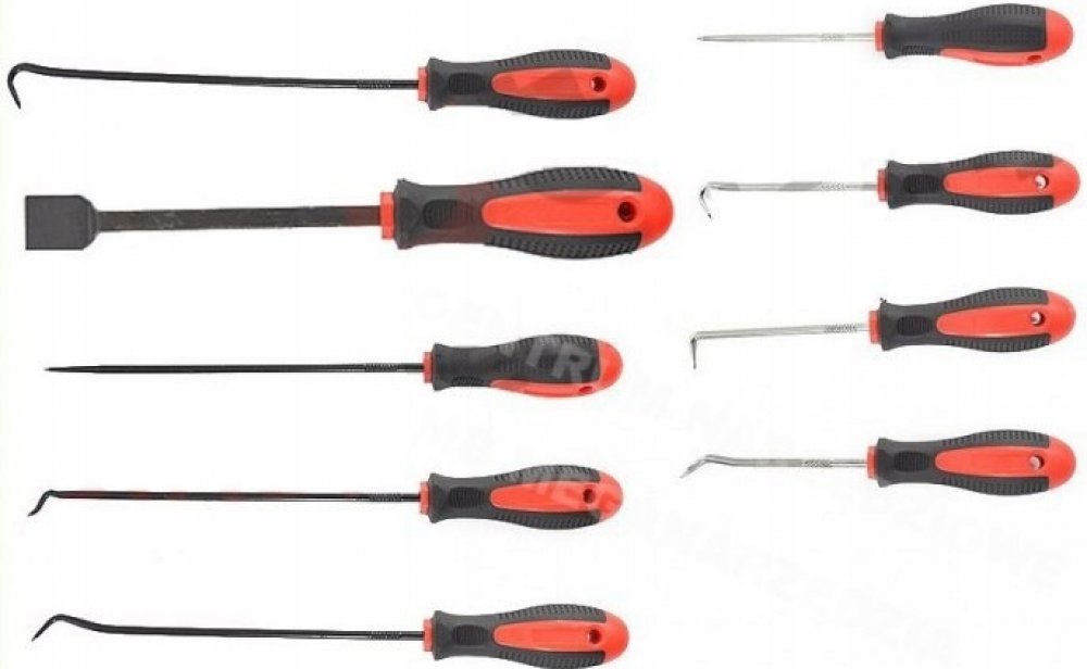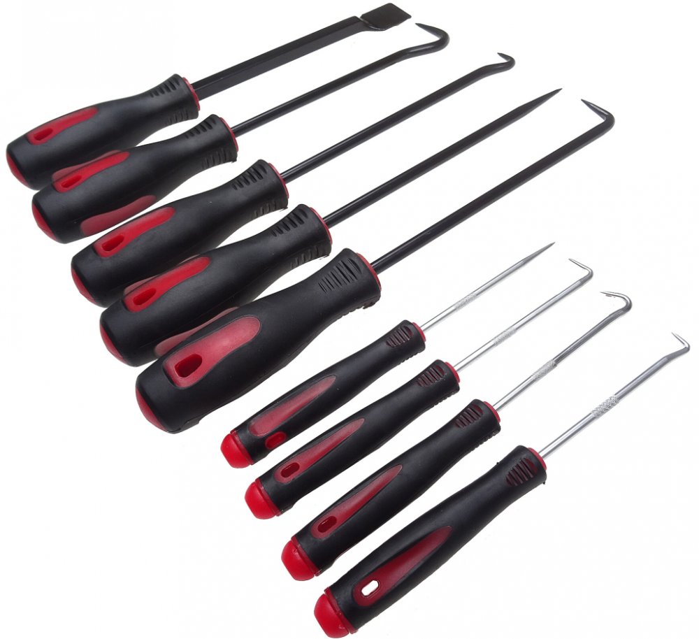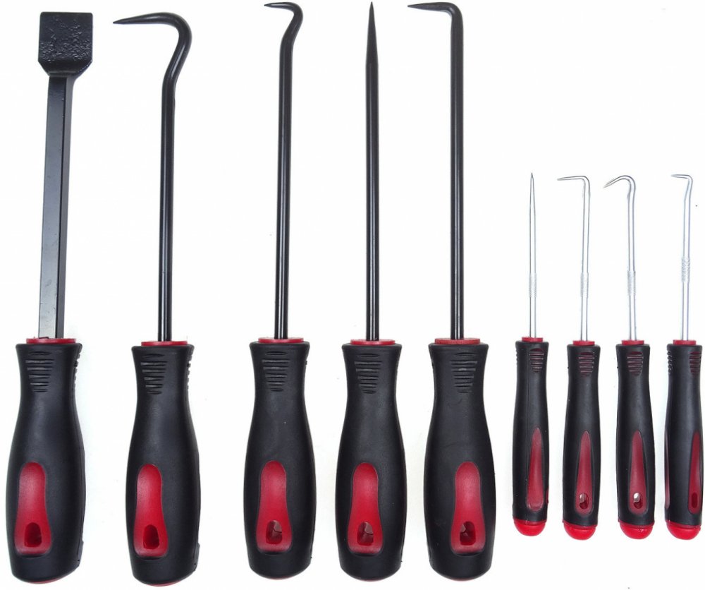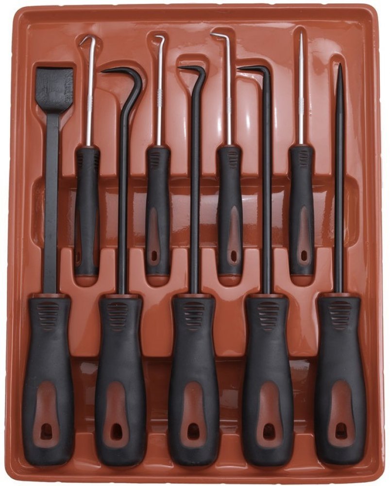 Praktická sada devíti univerzálních ocelových hrotů, špic a škrabky k odstraňování gufer, těsnění, O-kroužků, návleků, seškrabávání ztuhlých nečistot, propichování nádob aj. Háčky a špičky jsou různě velké a zahnuté, díky čemuž bude příští výměna těsnění hračkou.