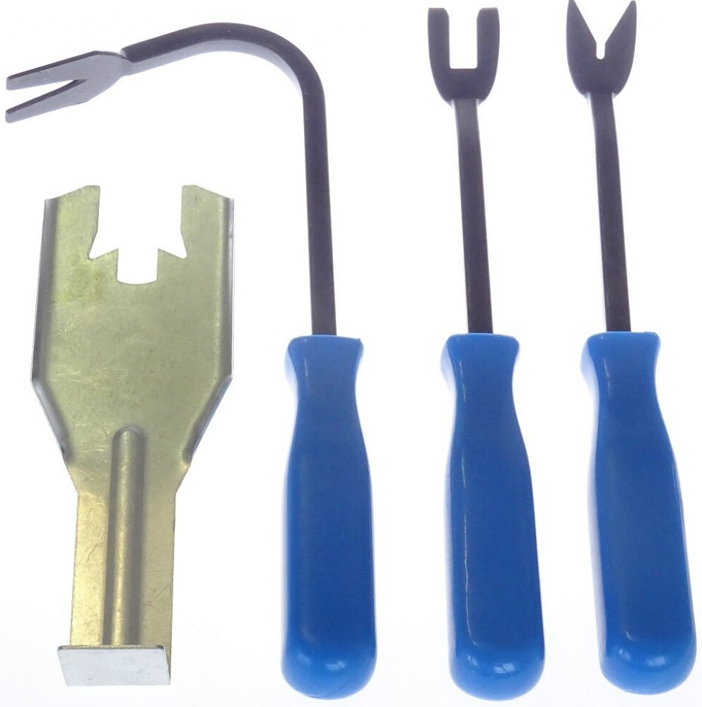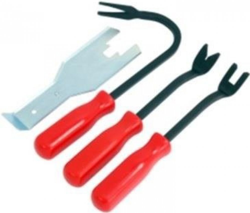 Nástroje na demontáž čalounění a stahovacích kliček oken, 4dílná sada – QUATROS QS14576 Sada vhodná zejména k odstrojení automobilových dveří: obsahuje sadu tří různě zahnutých nástrojů k vycvakávání cvočků, příchytek a spon čalounění pro snadnou a rychlou demontáž. Plechový přípravek potom slouží k demontáži kličky stahování manuálních oken, které jsou zajištěné drátovou pojistkou („sponkou“). Ta se tímto nástrojem vycvakne, poté lze kličku stáhnout z osy. Obsah sady: 1× přípravek na demontáž kličky stahování oken 1× nástroj (tzv. vidlice) s U-profilem 2× nástroj (tzv. vidlice) s V-profilem